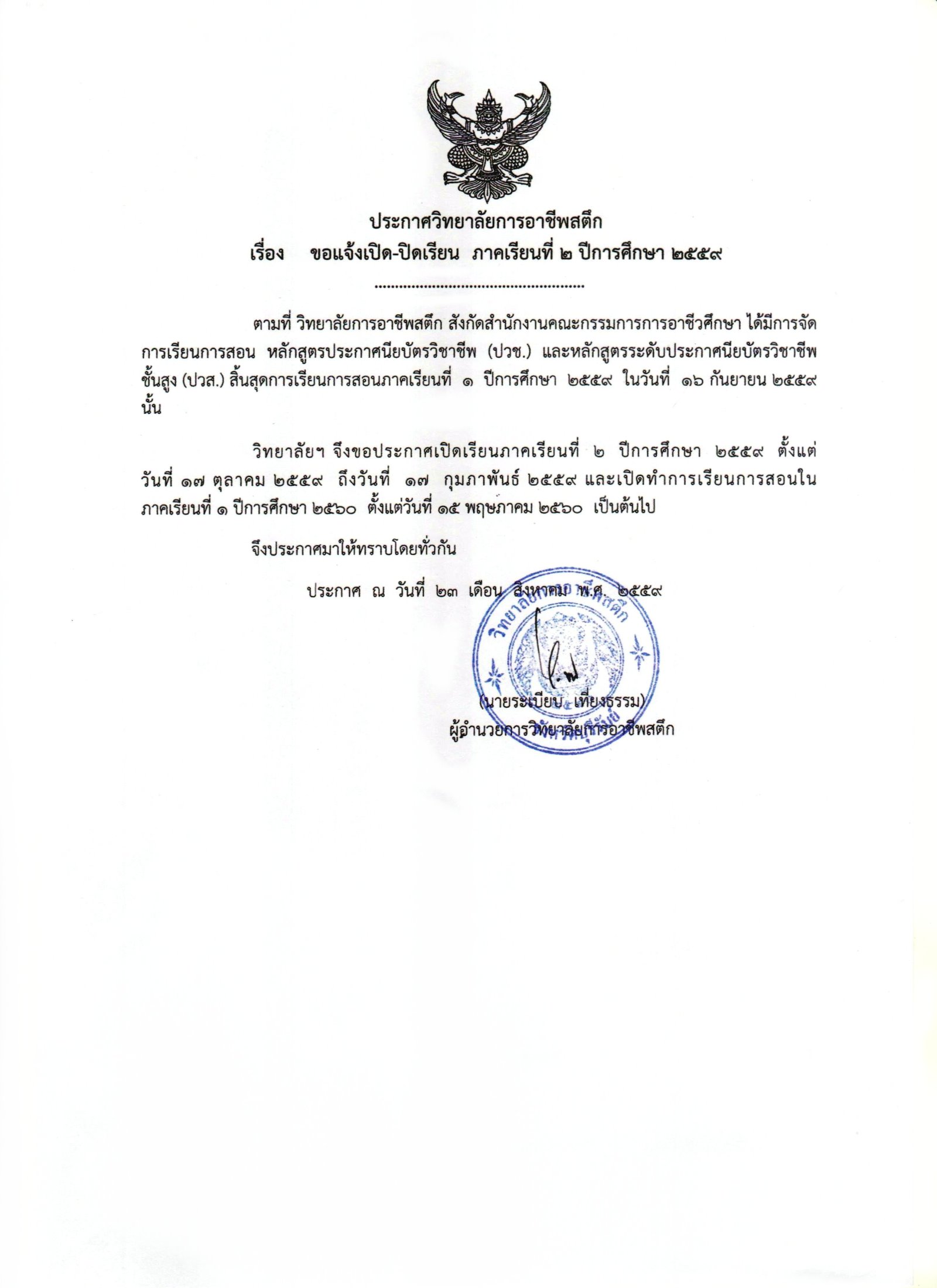 ประกาศ เปิด-ปิดเรียน ภาคเรียนที่ 2 ปีการศึกษา 2559