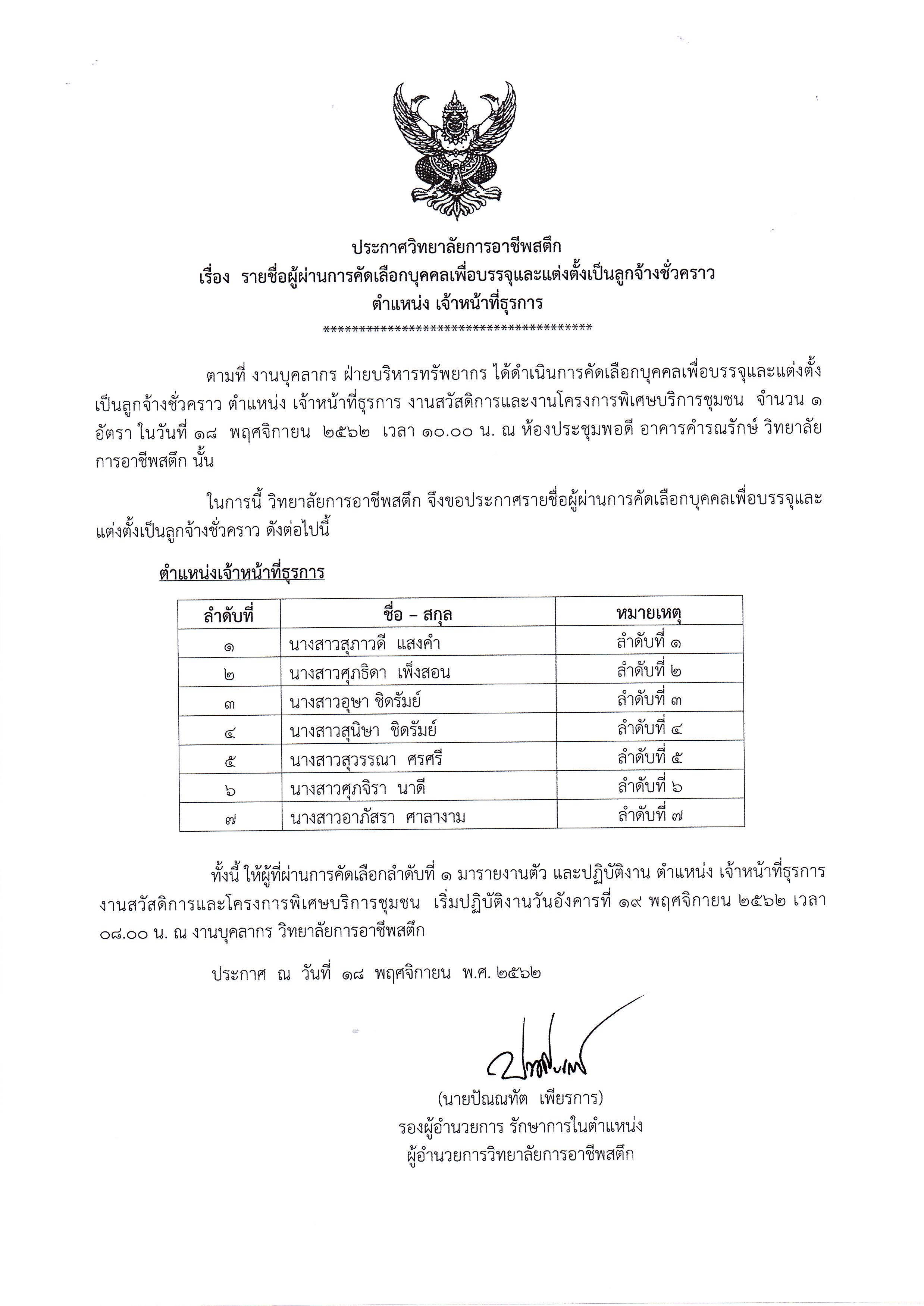 รายชื่อผู้ผ่านการคัดเลือกเพื่อบรรจุและแต่งตั้งเป็นลูกจ้างชั่วคราว ตำแหน่งเจ้าหน้าที่ธุรการ